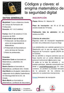 Curso online "Curso. Códigos y claves: el enigma matemático de la seguridad digital" CPR Avilés - Occidente. Curso virtual de 40 h (4.0 créditos), dirigido a profesorado de Secundaria en activo de la especialidad de Matemáticas y Profesorado de Secundaria en activo del área de Ciencias. Contenidos: Esteganografía y sistema de cifrado clásico de transposición (la escítala espartana) y sustitución monoalfabética (A1Z26, Atbash, Polibio, César...), sistemas de cifrado clásico de sustitución, polialfabéticos (Alberti, Trithemius, Vigenère...), nociones básicas de criptografía moderna, iniciación al RSA, aplicaciones y computación cuántica, ciberseguridad en el aula. Guía de buenas prácticas: 15 recomendaciones básicas.