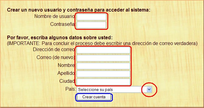 (3) Rellena todos los campos señalados, debidamente cumplimentados. Debes elegir un nombre de usuario (aquel con el que quieres aparecer en el curso), escrito sin espacios... La contraseña la eliges tú. Coloca una que sea sencilla y fácilmente recordable. La clave la puedes volver a cambiar más adelante, cuando ya estés en el curso. Cuando hayas rellenado todos los campos, pulsa al final "crear cuenta".