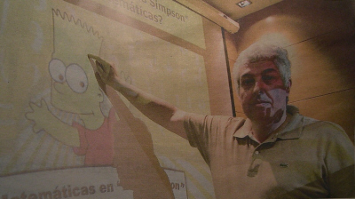 Abel Martín, ayer, en el Centro de Servicios Universitarios con sus apuntes sobre «Los Simpson». Así, quienes se crean unos auténticos conocedores de la serie por ser capaces de repetir de principio a fin todos los diálogos de cada una de las dieciocho temporadas tienen ahora un nuevo reto, esta vez de origen matemático. Quien quiera saber más puede saciar su sed de conocimientos en la página dedicada al mundo del cine y las matemáticas que Abel Martín ha puesto en funcionamiento hace apenas dos meses y que ya cuenta con más de 40.000 visitas: www.mathsmovies.com. Ésta y otras curiosidades matemáticas del mundo del entretenimiento serán el objeto de estudio de la tercera edición del curso de verano «Una mirada a las matemáticas a través del cine y la televisión» que dirige -desde hoy y hasta el próximo viernes, día 11- el profesor de la Universidad de Oviedo, Luis José Rodríguez, en el Centro de Servicios Universitarios. Según Luis José Rodríguez, el aforo se ha completado en cada una de las tres ediciones: «Se han cubierto la totalidad de las 50 plazas ofertadas y, aún así, contamos con más de 150 alumnos en lista de espera». La Nueva España. Martes 08 de julio de 2008